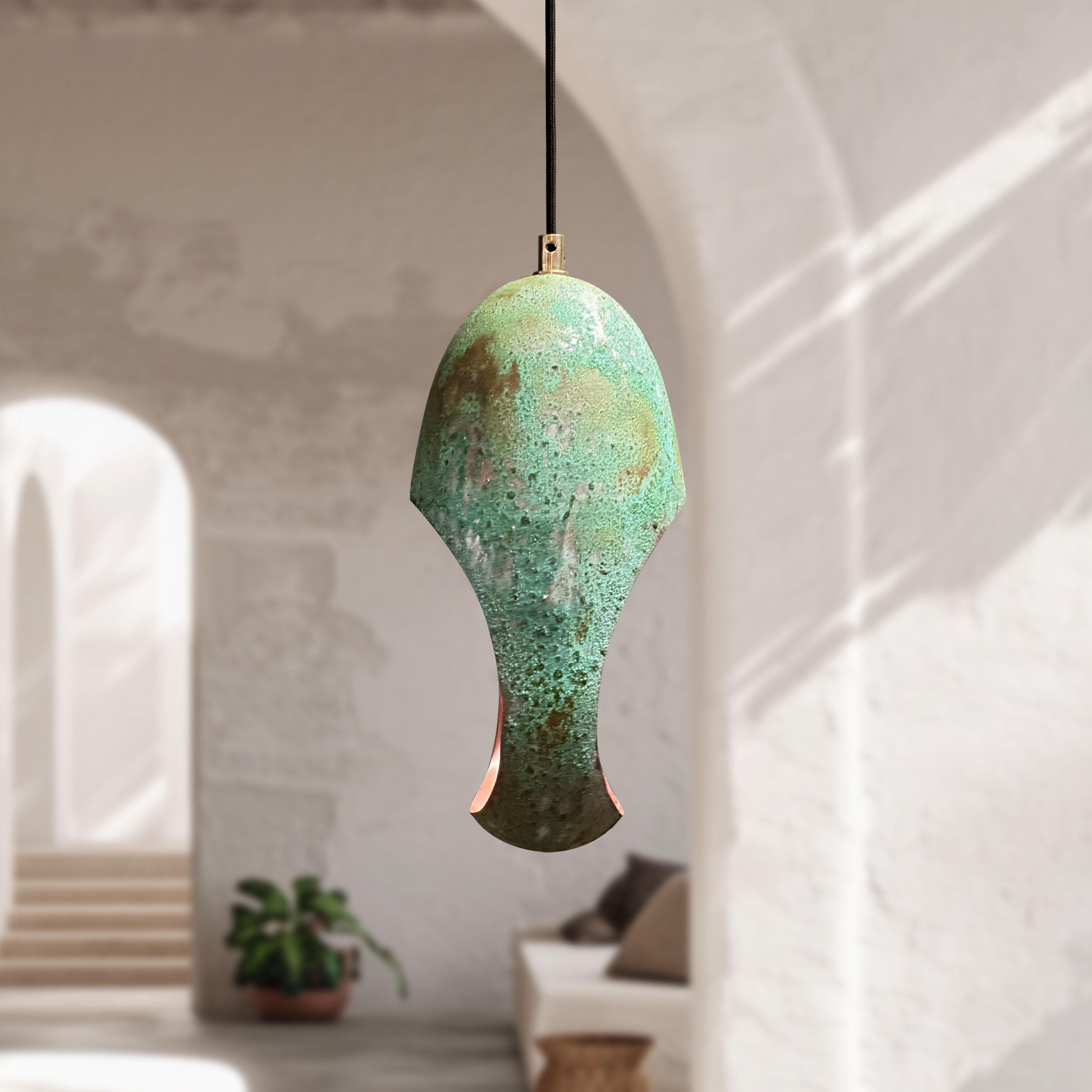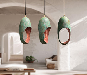 Set of 3 Handmade Green Patina Farmhouse Light Fixture, Set of Three Handcrafted Oval Cut Copper Pendant Light with Green Patina Finish