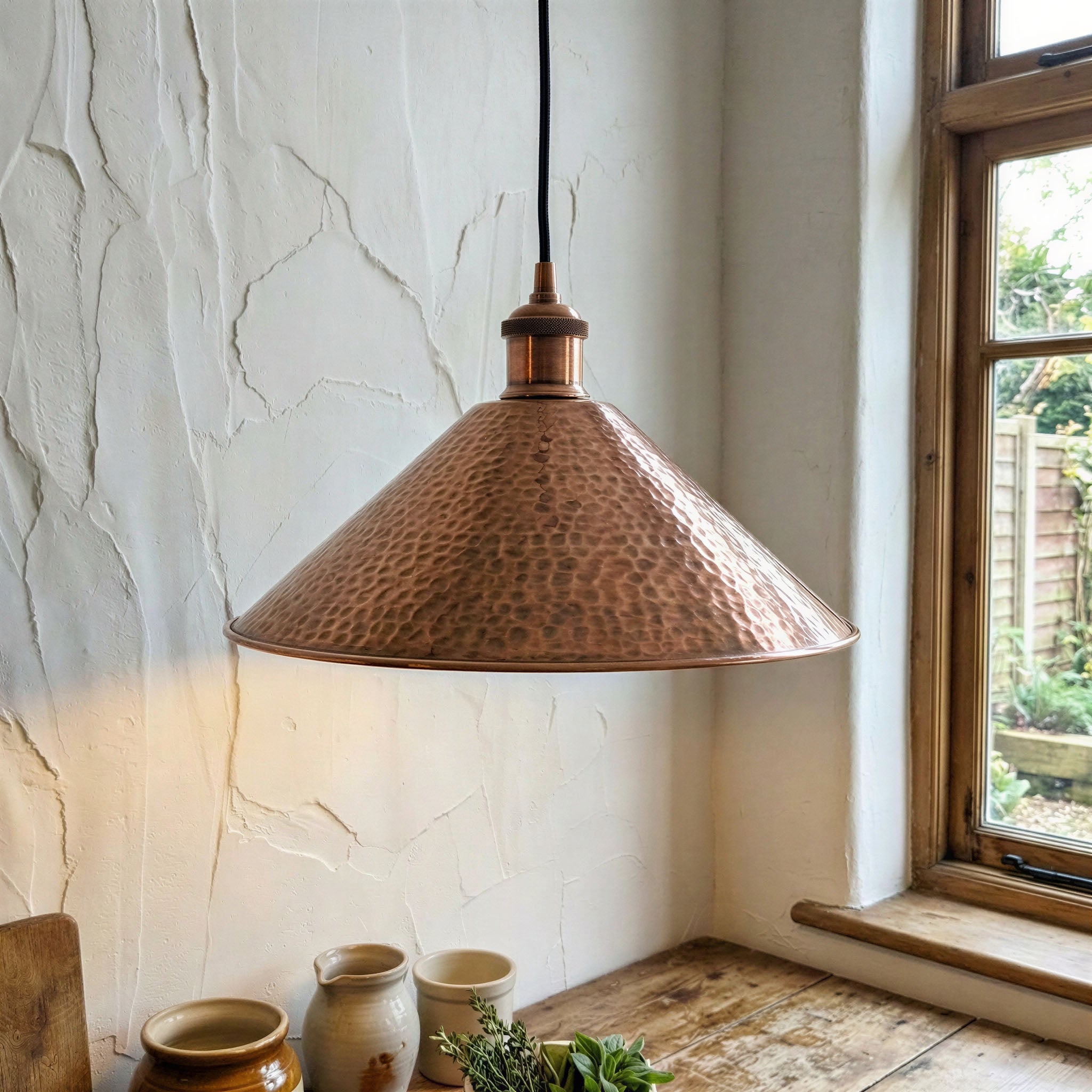 Hammered Copper Pendant Light – Large Cone Metal Shade for Dining Room or Farmhouse Kitchen