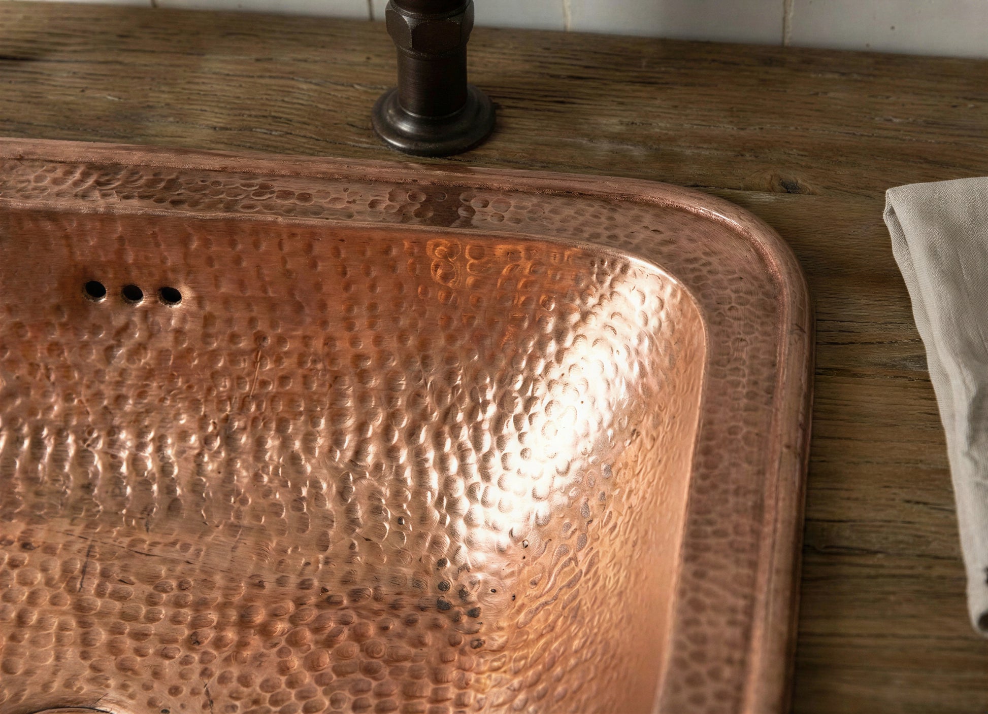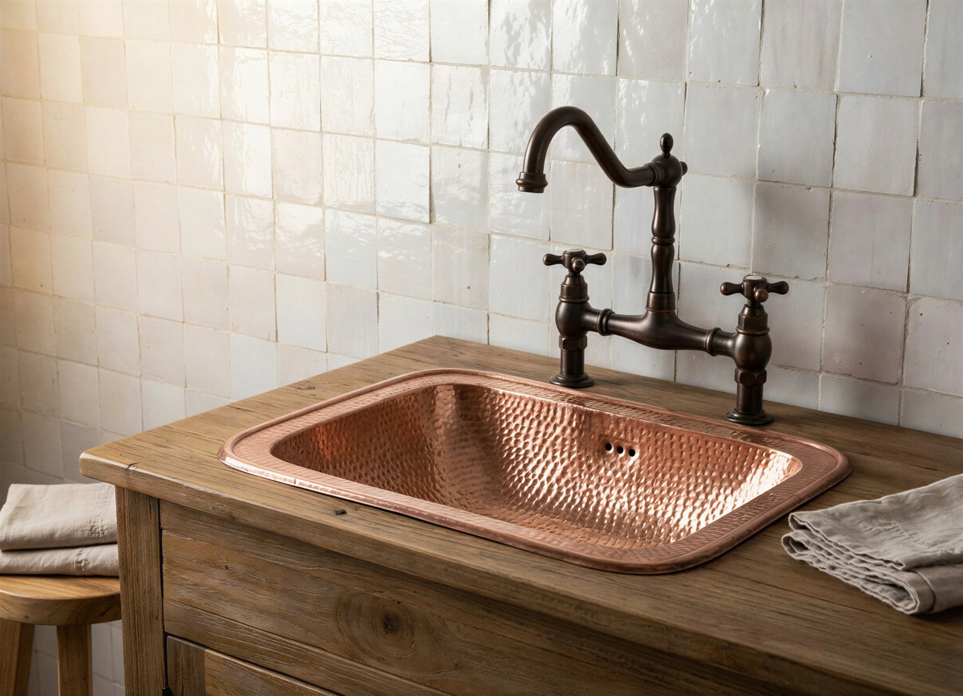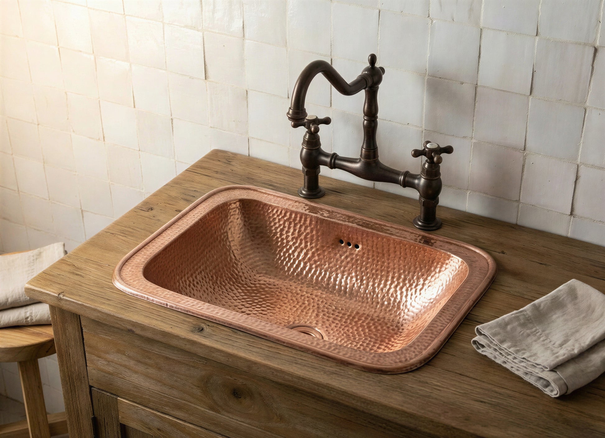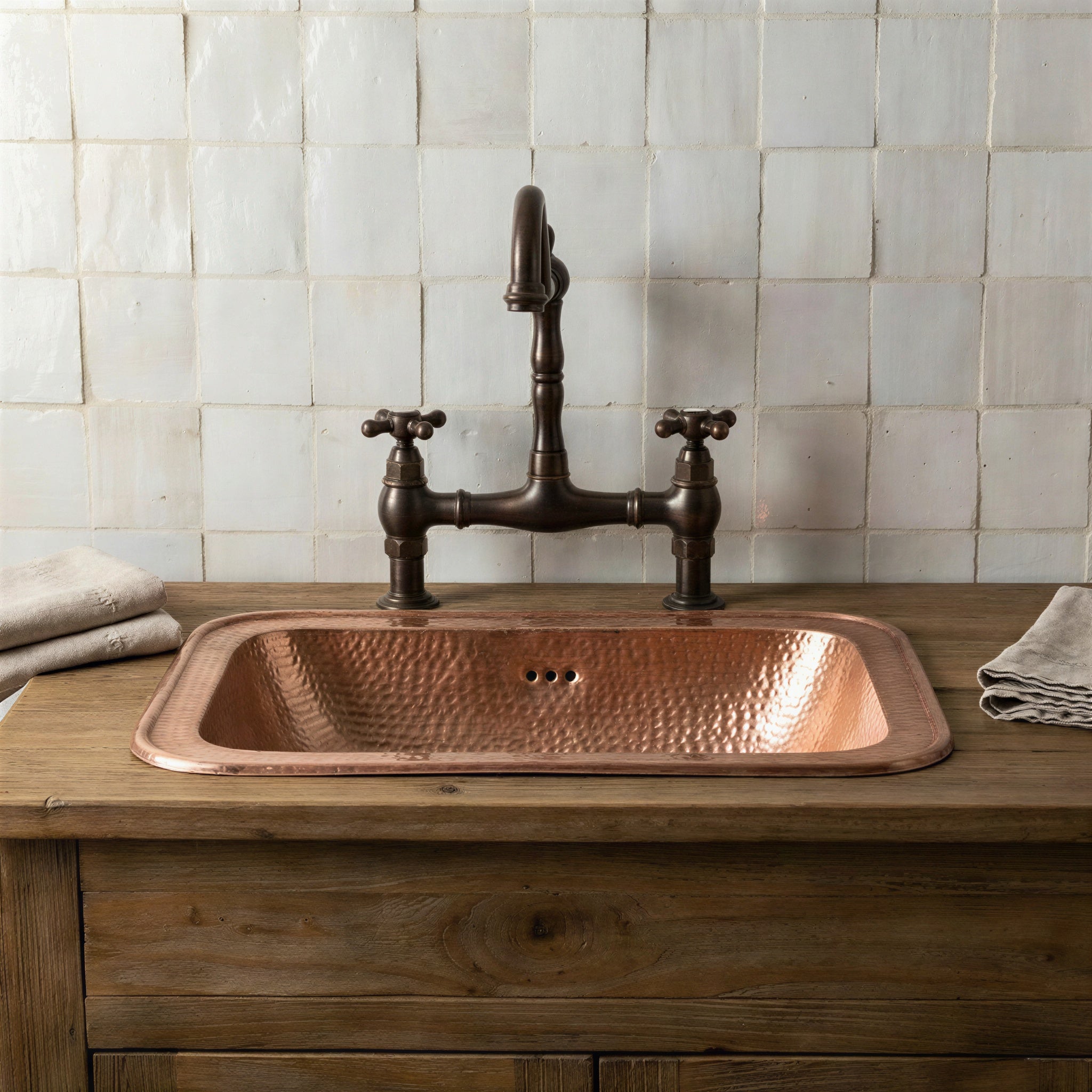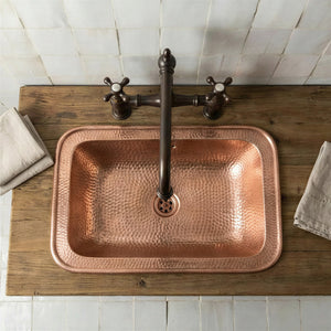 Hand Hammered Copper Drop In Sink | Rectangular Rustic Vanity Washbasin with Flat Rim
