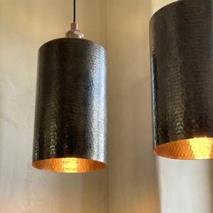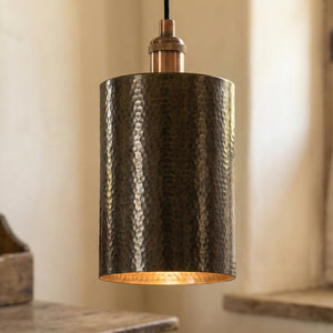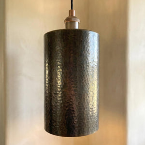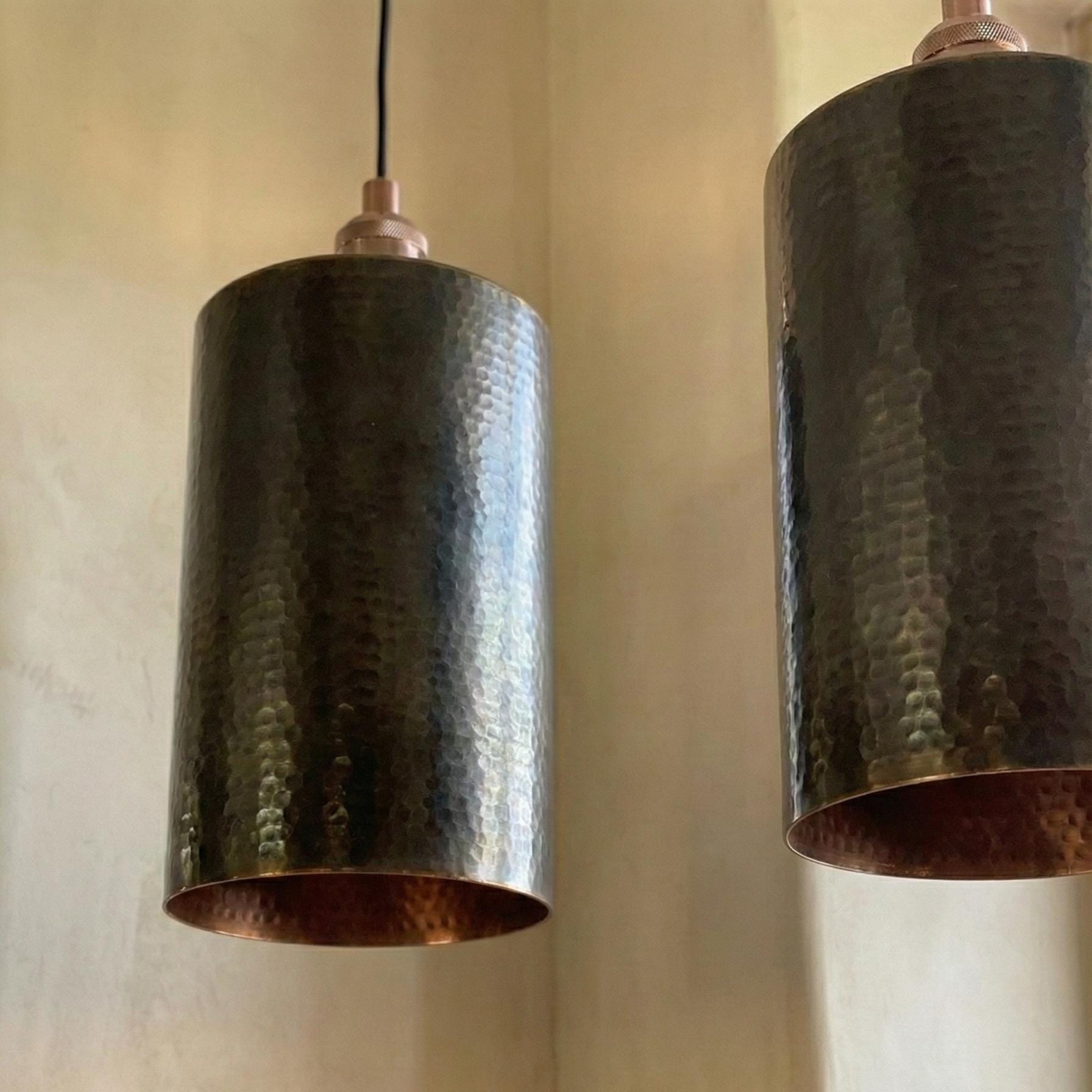 Handcrafted Brass Tube Light, Tall Hammered Pendant for Dining Room, Oxidized Brass Ceiling Lamp, Minimalist Cylinder Downlight