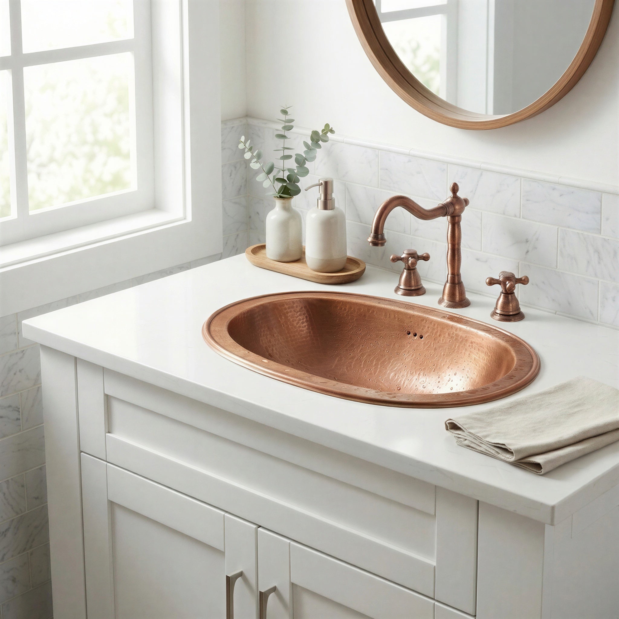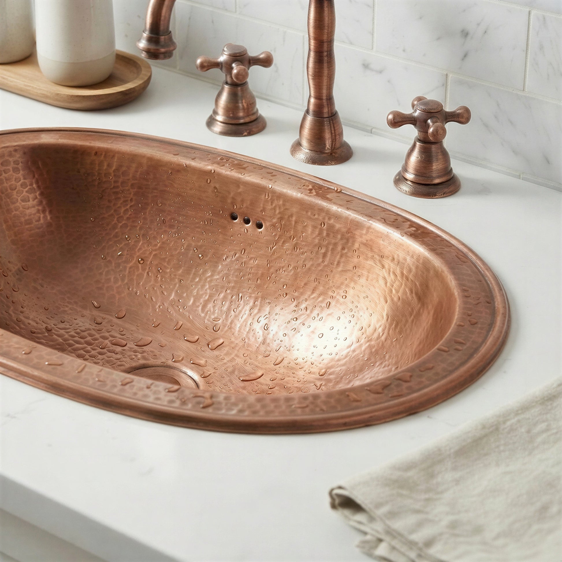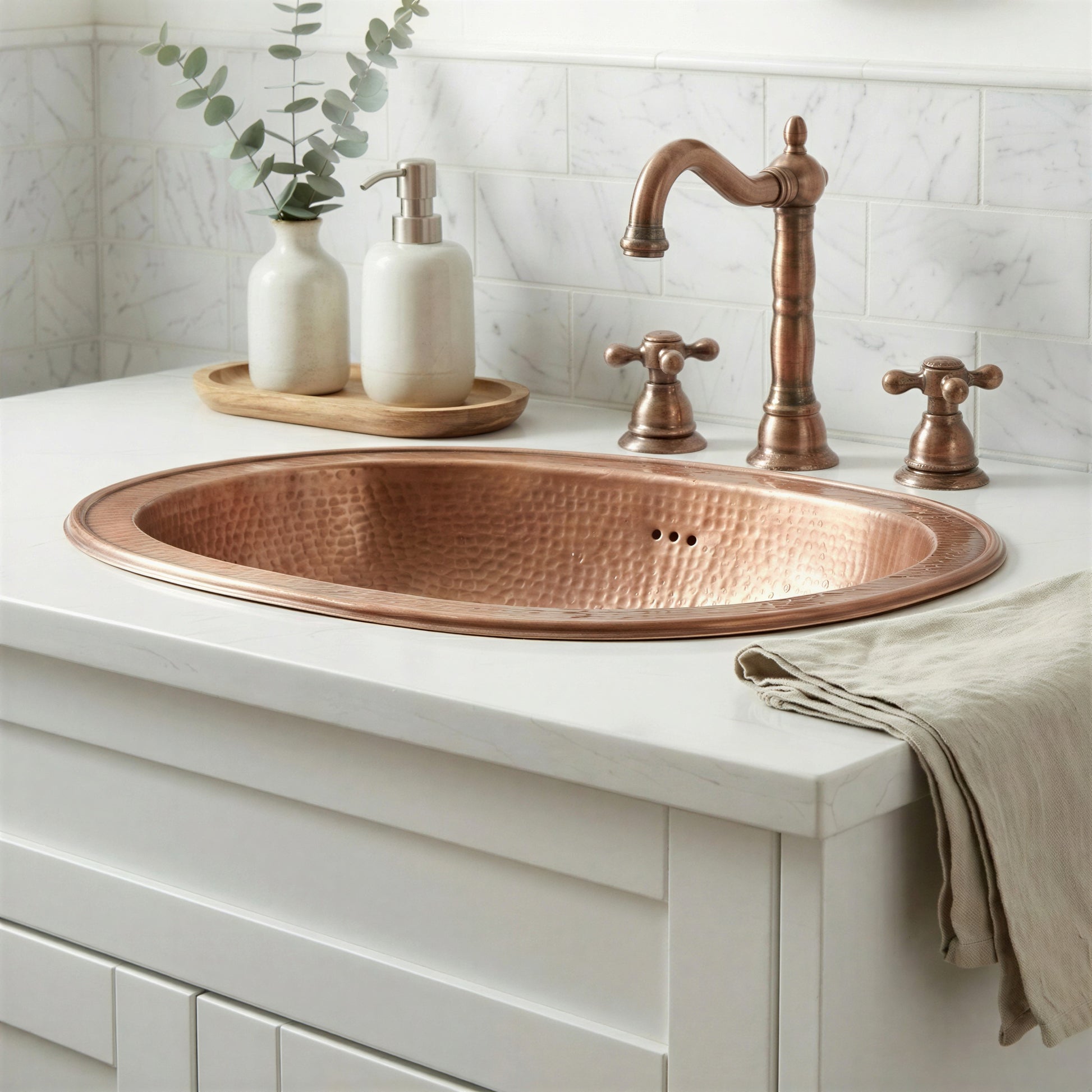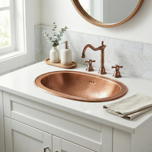Oval Copper Bathroom Sink, Drop In Basin with Overflow, Rustic Farmhouse Washbasin, Handmade Drop In Copper Sink