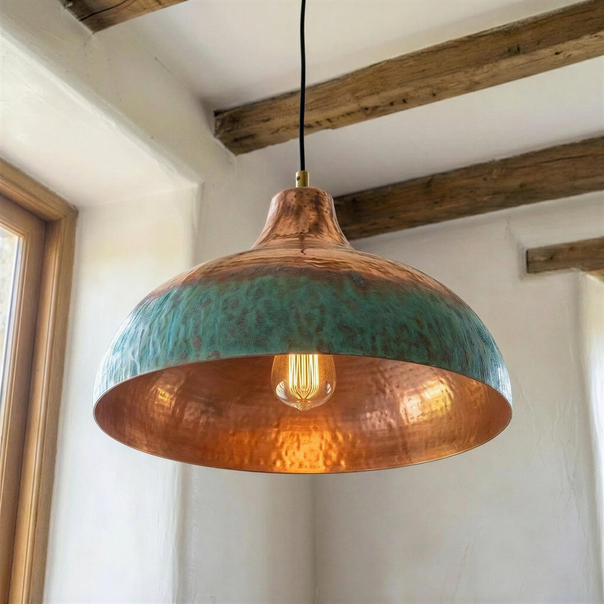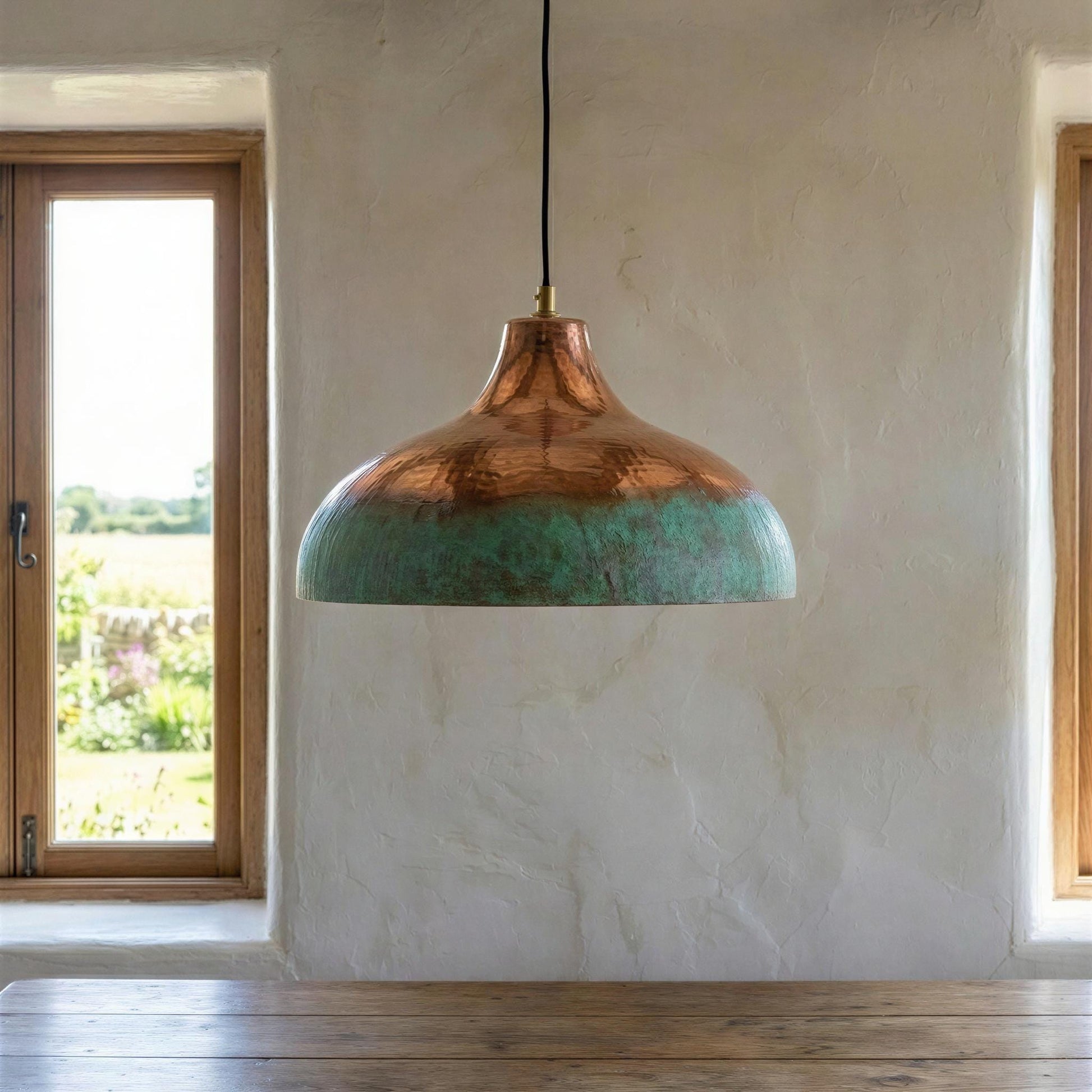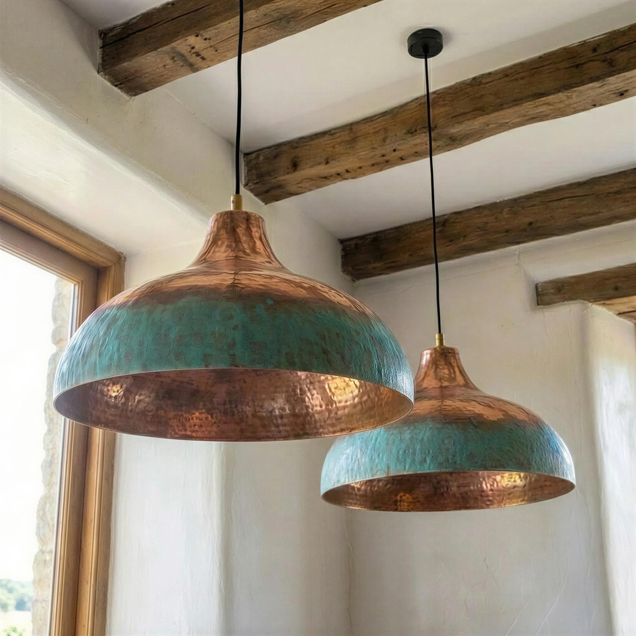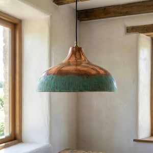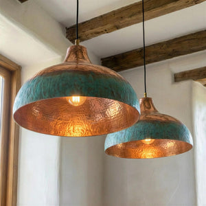 Two Tone Copper Pendant Light, Half Oxidized Verdigris Dome, Green and Copper Shade