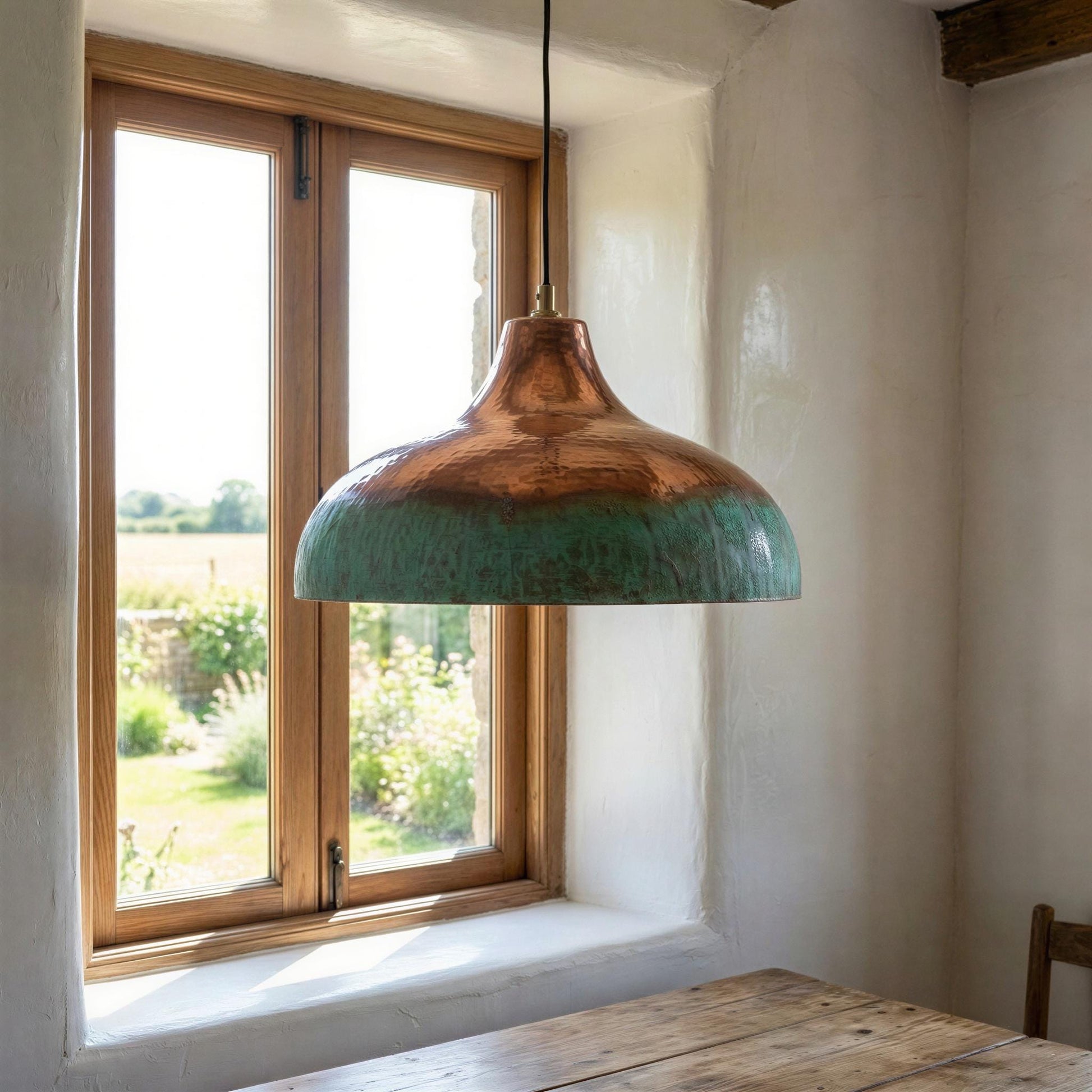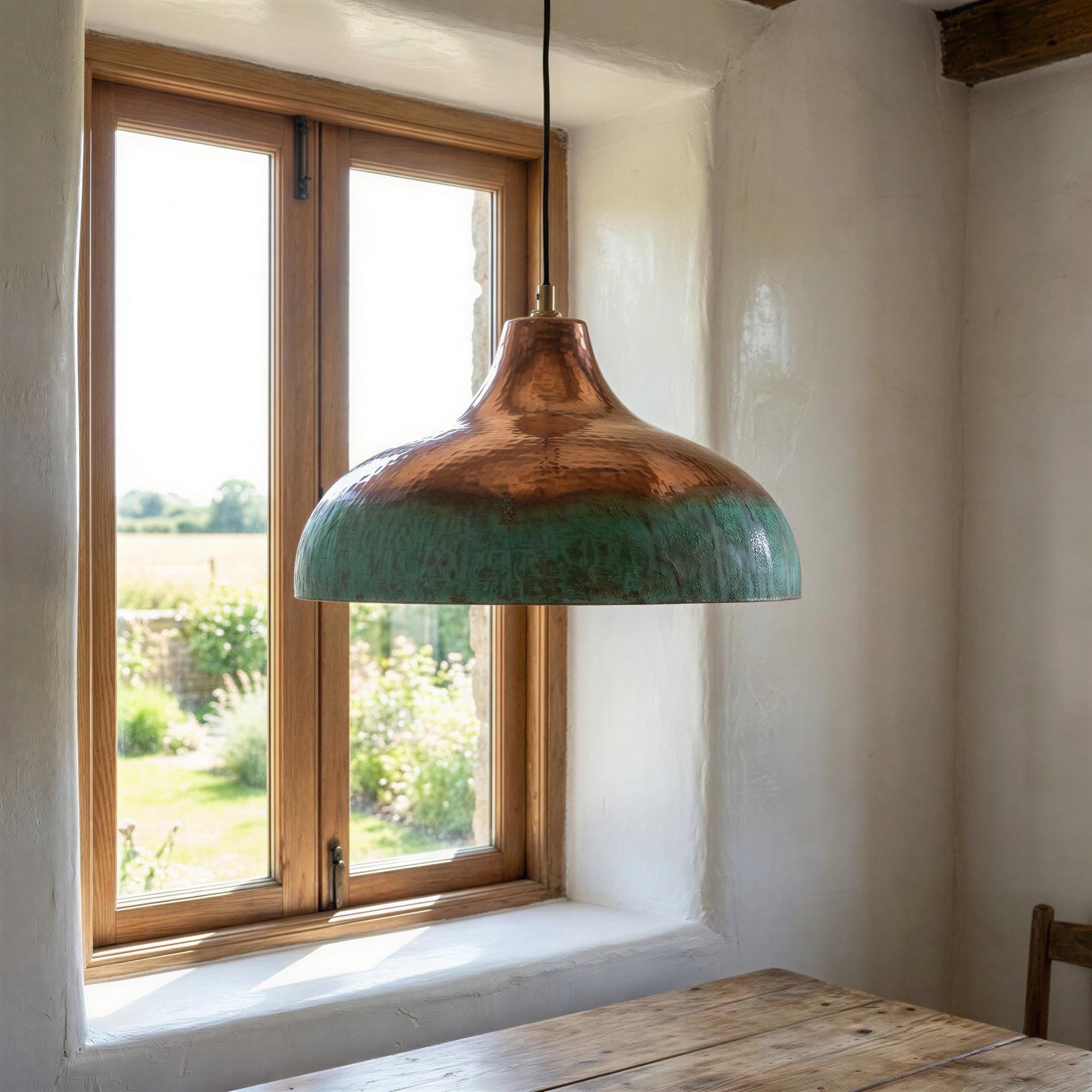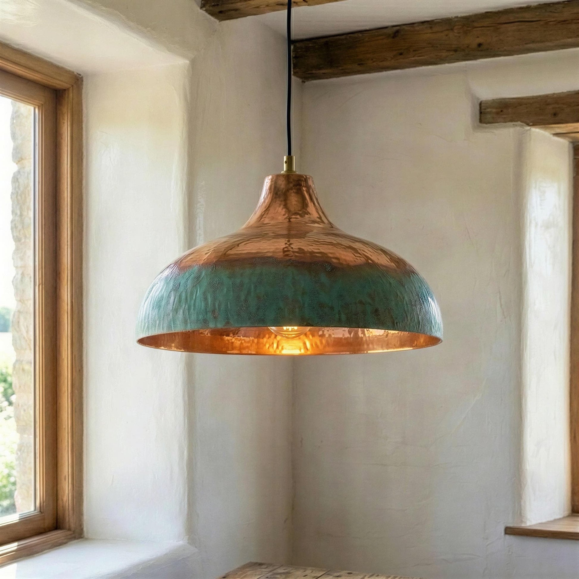 Two Tone Copper Pendant Light, Half Oxidized Verdigris Dome, Green and Copper Shade