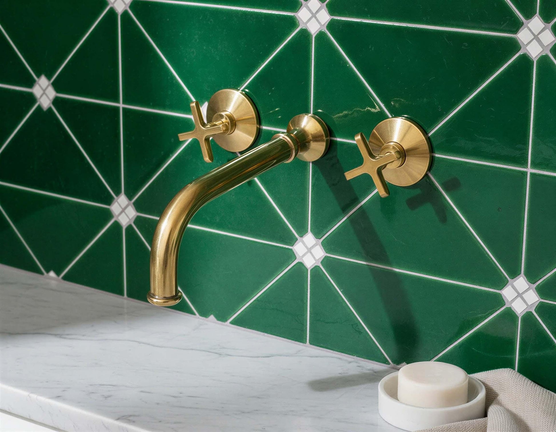 Unlacquered Brass Wall Mount Faucet - Modern Gold Bathroom Mixer - Minimalist Cross Handles, Scalloped Brass Wall Faucet, Wall Mounted Brass Faucet for Vessel Sink